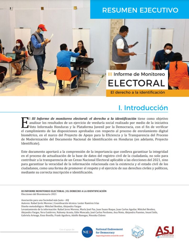 Tegucigalpa. Como resultado de las acciones emprendidas por la iniciativa ciudadana Voto Informado y la Asociación para una Sociedad más Justa (ASJ), este miércoles fue presentado el tercer Informe de monitoreo electoral: el derecho a la identificación.