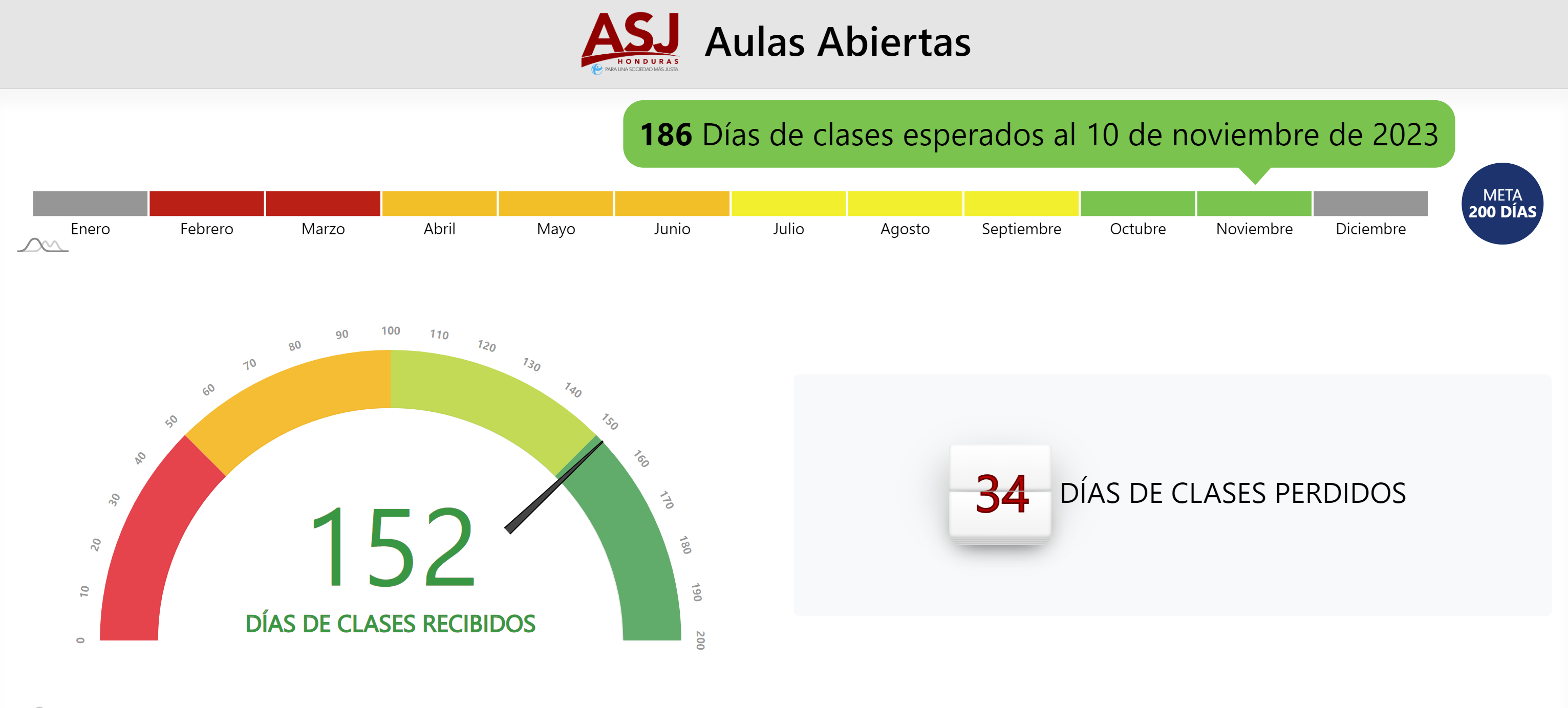 Tegucigalpa, 14 de noviembre de 2023. Los días de clase cumplidos aumentaron de 97 en 2022 a 152 en 2023, lo que representa un avance en garantizar el derecho a la educación para 1,846,031 de niños, niñas y adolescentes matriculados en el sistema educativo público hondureño y los acerca a recibir los 200 días de clase que estipula la ley, señaló este martes la Asociación para una Sociedad más Justa (ASJ) en la actualización del monitoreo de días clase a través de la plataforma “Aulas abiertas”.