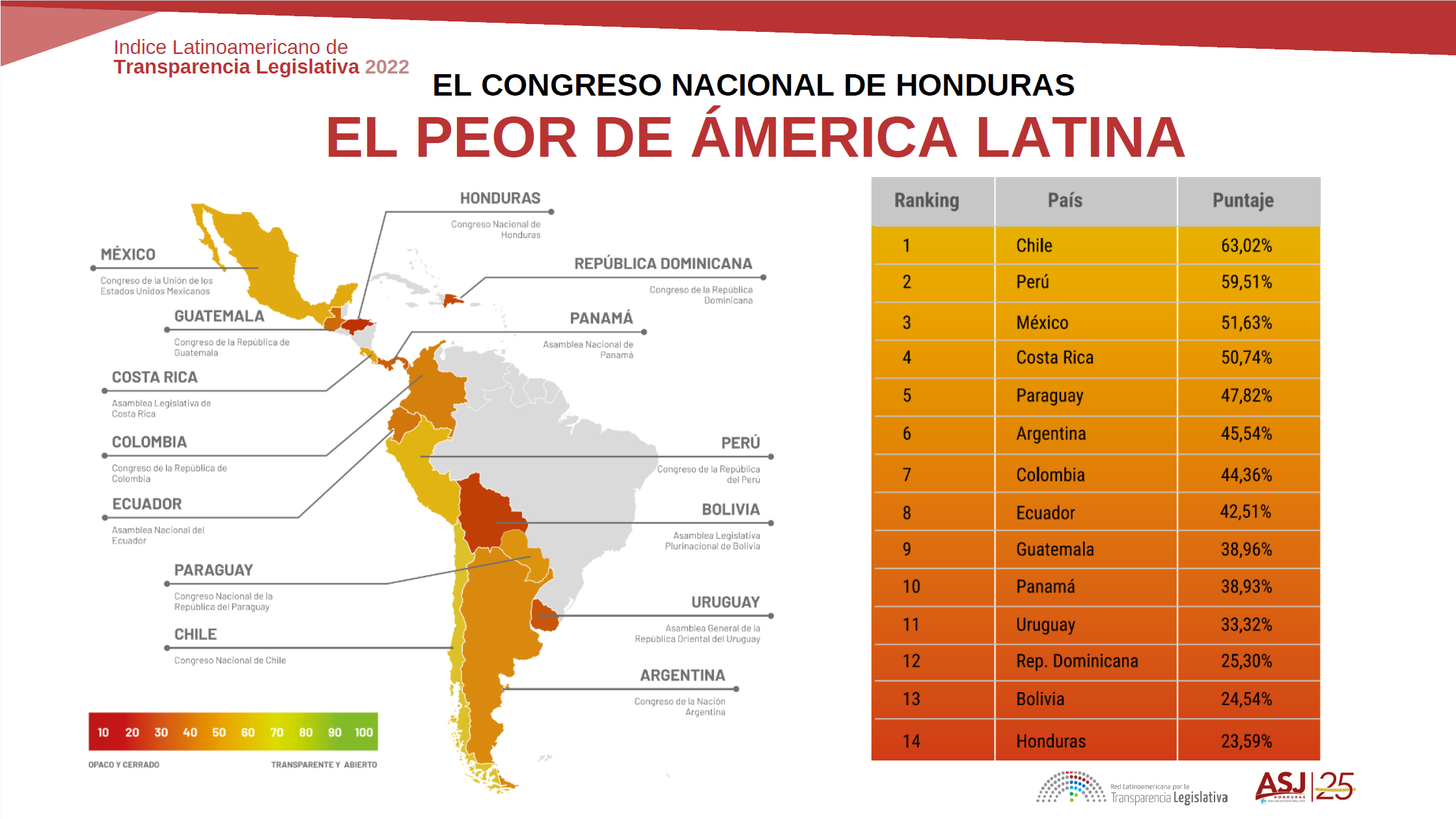 En su edición 2022, la investigación otorgó una puntuación final de 23.59 % de 100 % al Congreso Nacional hondureño en transparencia legislativa, muy por debajo de la media regional (42.18 %).