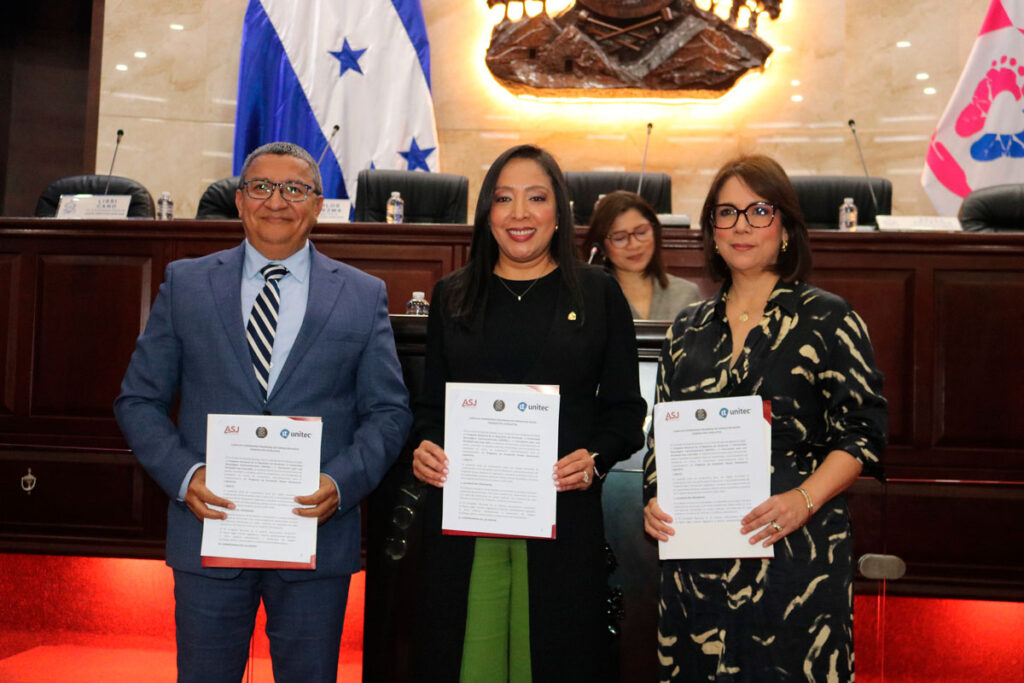 La carta de compromiso que marca el inicio del programa formativo fue firmada por: Lissi Matute Cano, vicepresidenta del Congreso Nacional; Rosalpina Rodríguez, rectora de Unitec, y Carlos Hernández, director ejecutivo de ASJ.