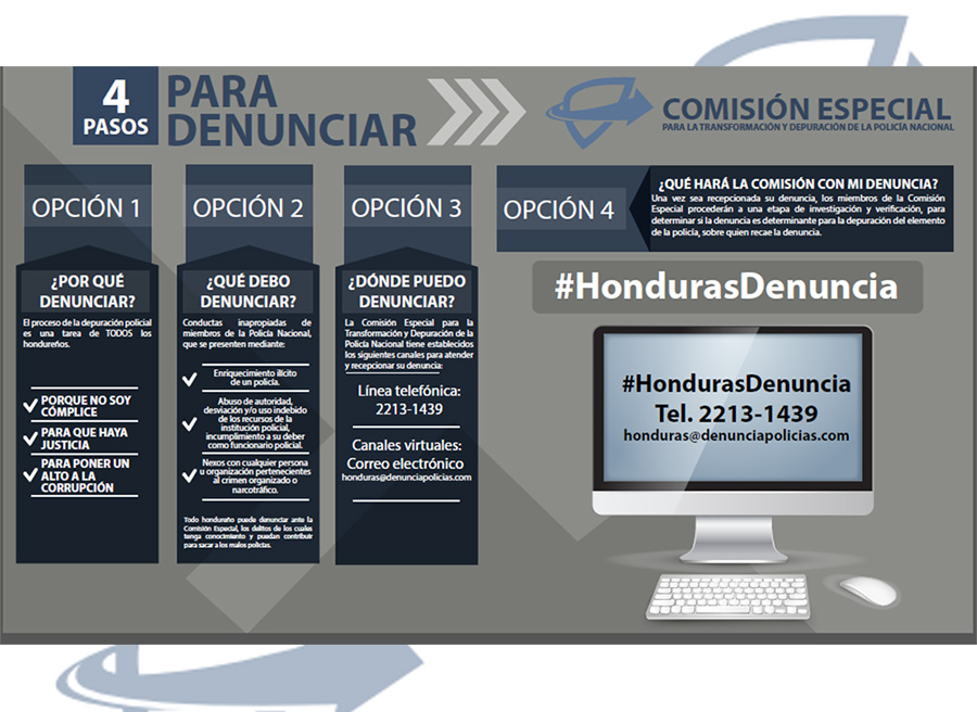 Tegucigalpa. Si es testigo o víctima de un acto ilícito por parte de uno o más elementos de la Policía Nacional, “Honduras Denuncia” le permite presentar sus quejas y denuncias ante la Comisión Especial para el proceso de depuración y transformación de la Policía Nacional.