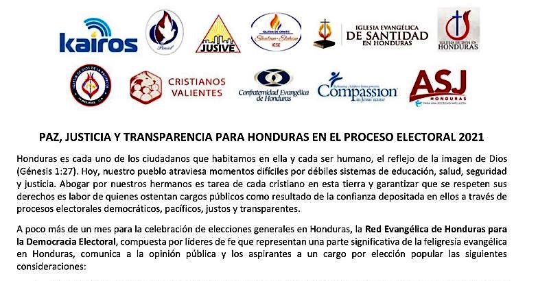A menos de un mes para la celebración de elecciones generales en Honduras, la Red Evangélica de Honduras para la Democracia Electoral, compuesta por líderes de fe que representan una parte significativa de la feligresía evangélica en Honduras, comunica a la opinión pública y los aspirantes a un cargo por elección popular las siguientes consideraciones: