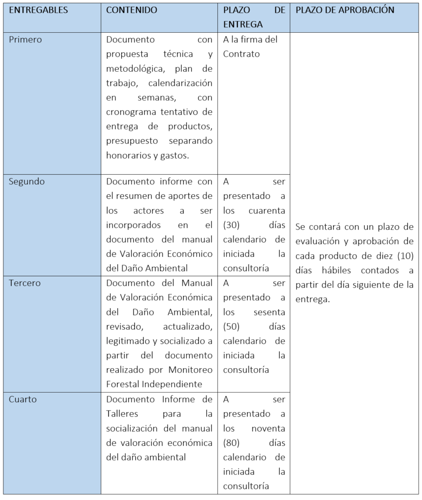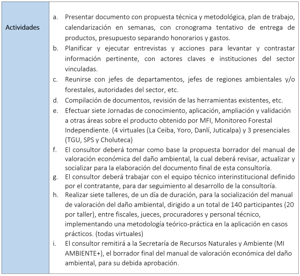 CONTRATACIÓN DE SERVICIOS PARA EL DISEÑO DEL PROTOCOLO PARA ELABORACION, DISEÑO, SOCIALIZACIÓN Y PRESENTACIÓN DEL MANUAL DE VALORACIÓN ECONÓMICA DEL DAÑO AMBIENTAL, EN EL MARCO DEL PROYECTO “FORTALECIMIENTO A LAS CAPACIDADES OPERATIVAS DEL MINISTERIO PÚBLICO Y DE LAS INSTITUCIONES VINCULADAS EN EL MANEJO FORESTAL”