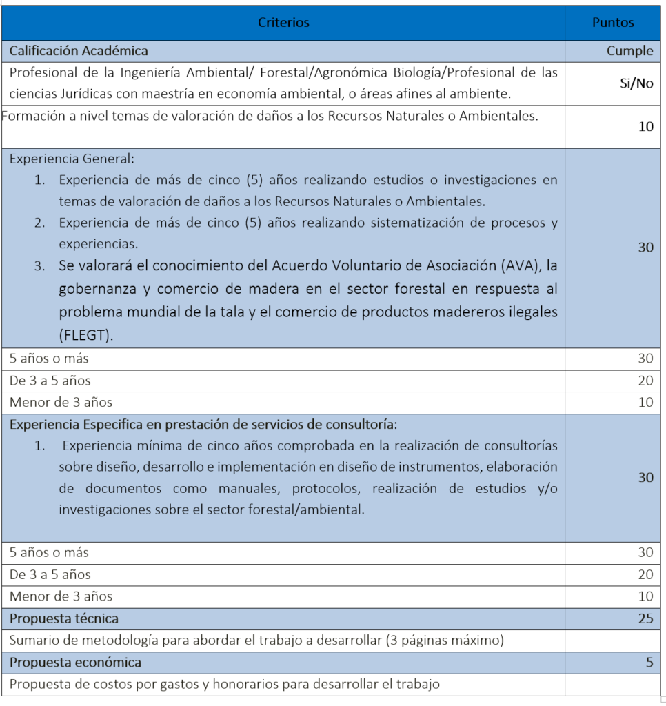 • Se valorará el conocimiento del Acuerdo Voluntario de Asociación (AVA),la gobernanza y comercio de madera en el sector forestal en respuesta al problema mundial de la tala y el comercio de productos madereros ilegales (FLEGT).