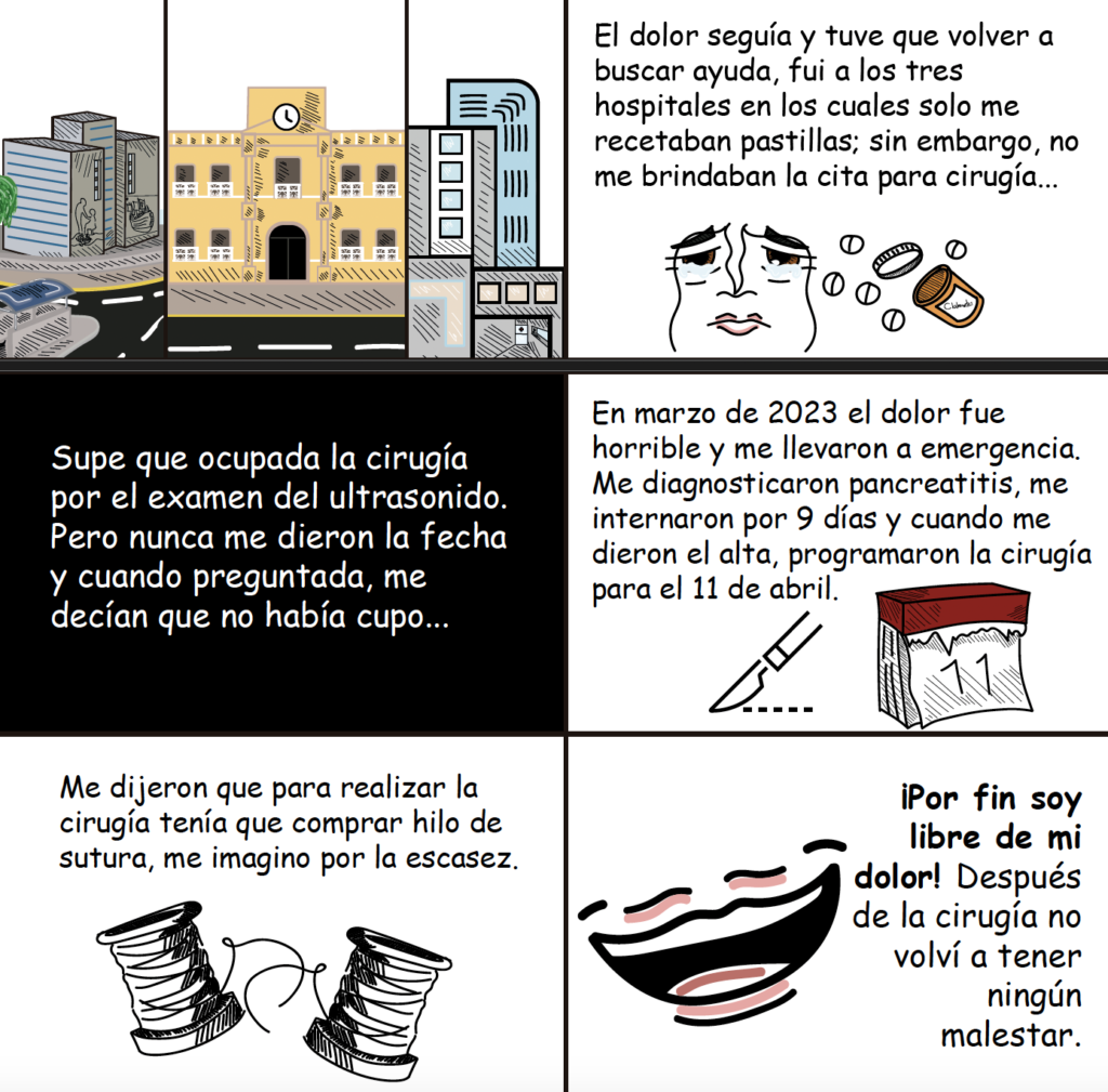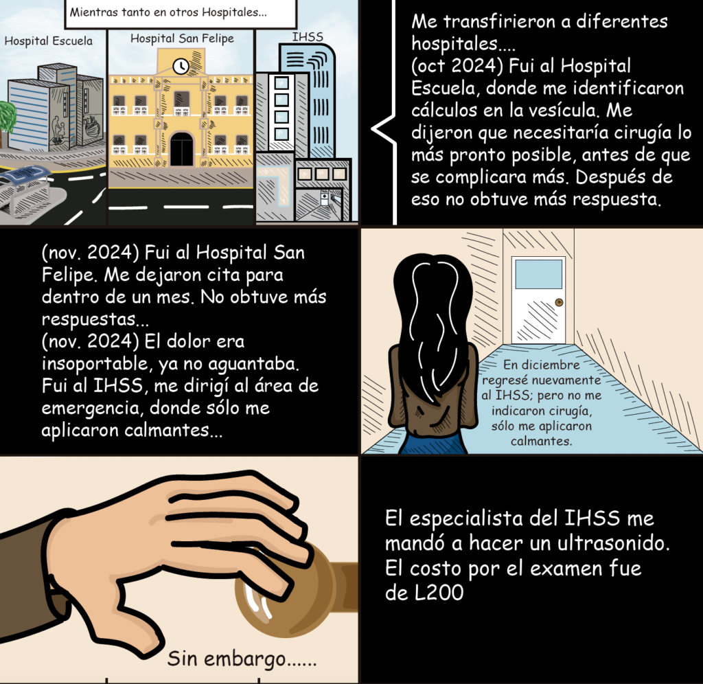 De forma similar, Fátima, una madre de familia que enfrentó una grave emergencia médica, relató que, a pesar de la urgencia de su condición por cálculos en la vesícula, el personal del Instituto Hondureño de Seguridad Social (IHSS) no programó la cirugía necesaria, limitándose a aplicar calmantes sin brindarle atención durante casi siete meses.